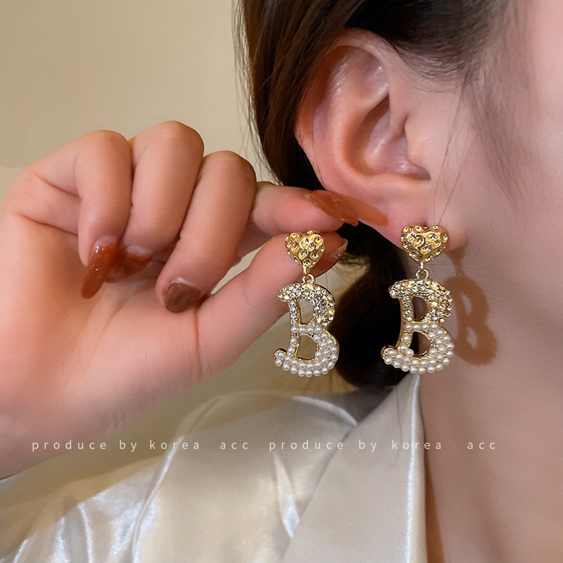 银针镶钻珍珠爱心字母耳环韩国复古个性气质耳坠小众设计感耳饰女热门设计联盟服务商